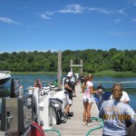 The ride to the lighthouse entrance to Greenport was rough but once inside and protected by Shelter Island and Greenport the ride was a lot nicer. This is always a nice ride with lots of views. Day trips out this way are awesome, but, unfortunately we were looking to make time and complete our trek in one day, so it was a steady run through Little Peconic and Peconic Bays to Shinnecock Canal. We made it for gas (12 gallons) before 6pm and then went to Tiderunners Restaurant on the canal for food – finally! It would’ve been nice to lounge longer but again we needed to make time again so ate quickly and we headed through Shinnecock Bay and Tiana Bay to the Quogue Canal – which is a 35-40 minute 5mph run, but a really a nice ride. Heading out of the Canal at Westhampton Beach and into Moriches Bay the sun was getting low really fast, but the water was flat and beautiful. We were figuring that the Great South Bay would be the same but no such luck for the end of the trip! It was pretty rough and we ran out of daylight in the end; but what an adventure. It was an awesome trip and a good time was had by all. Great day on the water. 7:30am – 9:00pm and 254 miles…next trip is up the Hudson on August 11 – 12, but we will make it an overnighter…any takers?