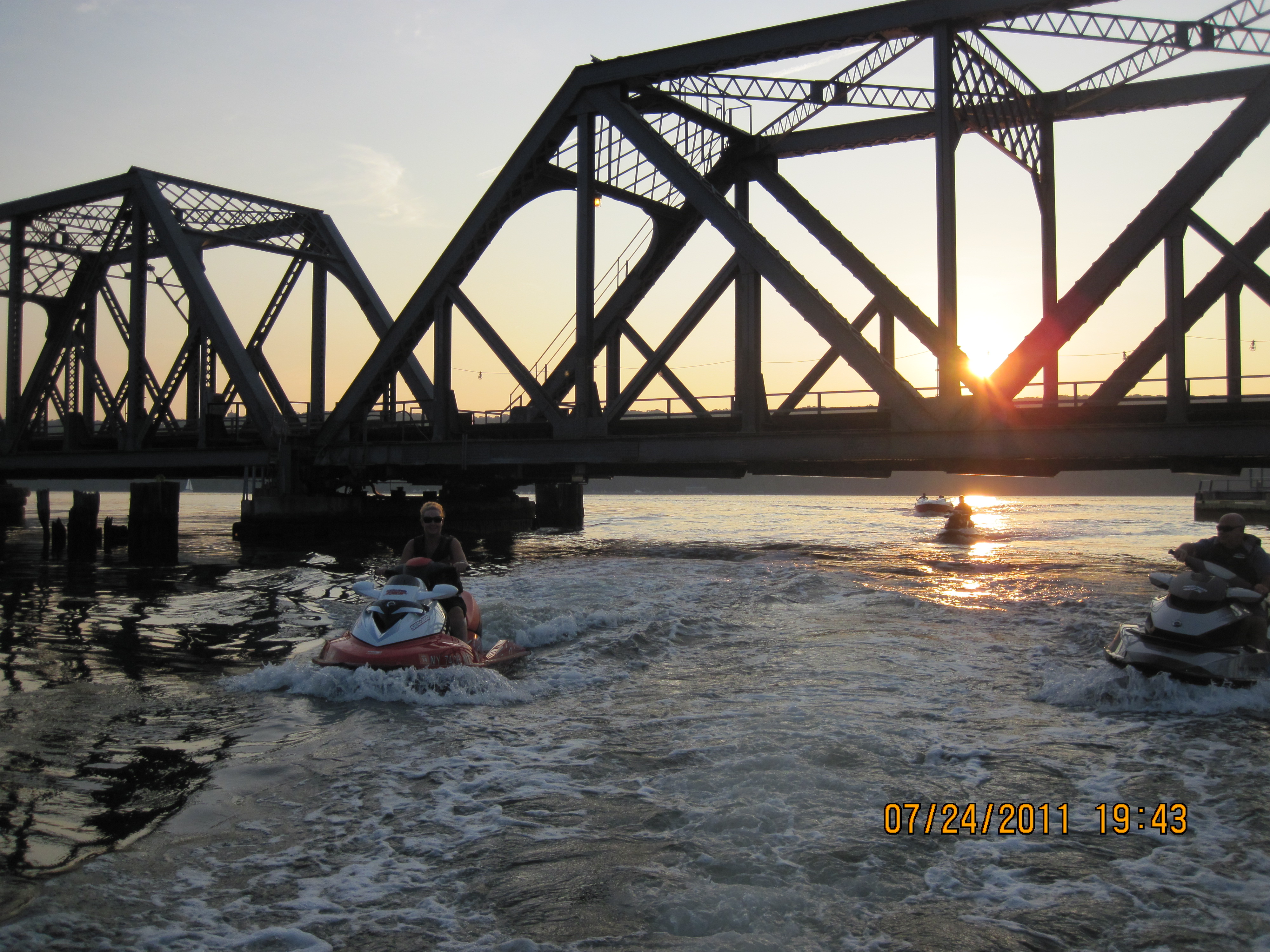 So the plan was to meet at the ramp at the end of Garvies Point Road in Glen Cove at 7:30am. I wanted to get the lower part of the river done early before the boat and ferry traffic picked up, making it too rough for pictures. Still not completely knowing what to expect of the water from the sewage (at this point the spill was stopped) I figured people to bail out, but I was pleasantly surprised when Yamadude Joe, his daughter Sarah, Geoff, Sid and Carin (and my wife) all showed up. Two guys were no shows (they let Joe know the night before) and 1 Doo was broken down on Saturday (stuck in reverse) so we lost some riders there as well. Including my trusty passenger and me we had 6 skis and 7 people. The ages ran from 16-61 with varying degrees of experience, from first trip to seasoned. Quite a diverse group. I wasn’t exactly sure how it was going to work out and mesh but I figured I would just go with it and see how it went and improvise as we cruised along. Well, I have to say, what a trip. And what a perfect mix of people in the in the end.